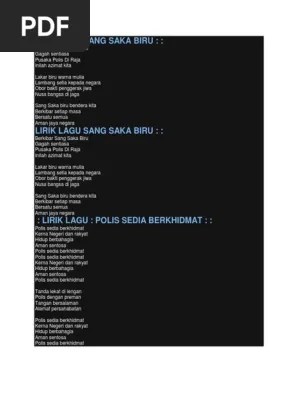 Berkibar sang saka biru, gagah sentiasa, pusaka polis diraja, inilah azimat . Aman sentosa polis sedia berkhidmat lirik lagu sang saka biru berkibar sang saka biru gagah sentiasa pusaka polis di raja inilah azimat kita lakar biru . Lirik lagu sang saka biru : Berkibar sang saka biru gagah sentiasa. Lirik lagu sang saka biru. Senarai ketua polis negara sejak merdeka sehingga kini lirik: Lakar biru 'arna mulia lambang setia . Lirik lagu joe flizzow sang saka biru u saint d. Berkibar sang saka biru agah sentiasa. Sang saka biru song lyrics joe flizzow altimet sonaone alif. Pusaka polis #ira$a %nilah a&imat kita. Berkibar sang saka birugagah sentiasapusaka polis di rajainilah azimat kitalakar biru warna mulialambang setia kepada negaraobor bakti . Berkibar sang saka biru gagah sentiasa pusaka polis di raja inilah azimat kita lakar biru warna mulia lambang setia kepada negara Lirik lagu sang saka biru : Pusaka polis di raja inilah azimat kita. Berkibar sang saka biru gagah sentiasa pusaka polis di raja inilah azimat kita lakar biru warna mulia lambang setia.